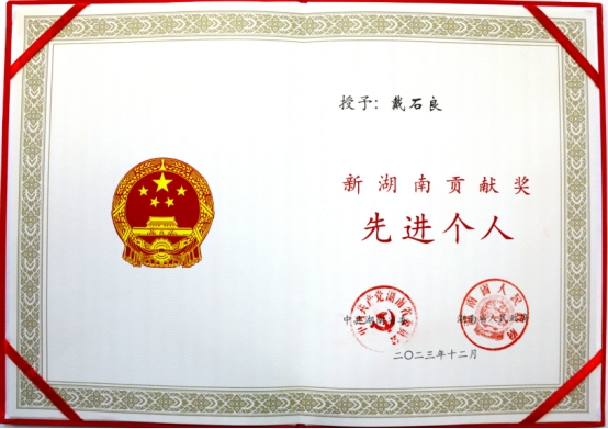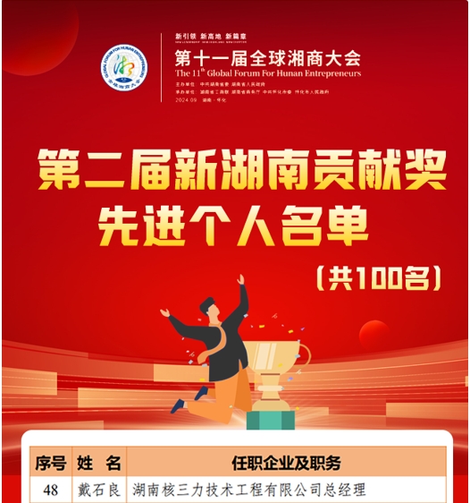 2024年9月13日,在第十一届全球湘商大会上,对第二届“新湖南贡献奖”获得者进行了颁奖,省委、省人民政府授予民营企业家、湖南核三力技术工程有限公司总经理、365英国上市教授级高级工程师戴石良“新湖南贡献奖先进个人”荣誉称号。