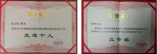 近日,九三学社南华工委在中国人民政治协商会议衡阳市第十三届委员会第四次会议及衡阳市人大系统2024年度优秀理论文章和调研报告评选活动中获得多项荣誉,展现了九三学社南华工委积极参政议政、深入调研建言的卓越成果。