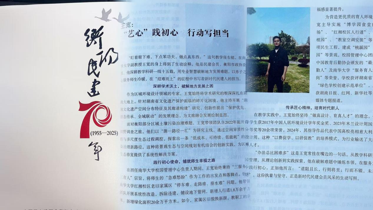此外,支部另一位优秀会员王宽的先进事迹也被收录于大会特别编印的纪念册《衡阳民建70年(1955-2025)》中。在“会员风采”专栏里,记载了他在本职工作和专业方向的突出表现。这本纪念册全面记录了衡阳民建70年来的发展历程,王宽同志的先进事迹入选其中,既是对他个人工作的肯定,也展现了民建南华支部会员的整体素质和精神风貌。