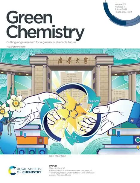2021年加入365英国上市后,何卫民团队连续在国际绿色化学领域顶级期刊《Green Chemistry》上发表研究论文。发表的第一个工作清洁电催化物质转化反应,利用无痕的电子替代传统的化学氧化剂,使用廉价易得的芳香肼、乙酰丙酮衍生物和二硒醚化合物为原料,通过一锅煮电化学反应高效制备了一系列生物活性的硒醚化吡唑化合物。研究成果不仅被编辑部推荐为封面论文,还被英国皇家化学会全文报道,论文还连续两次入选ESI 1‰热点论文、多次入选ESI1%高被引论文。利用这次难得的封面论文机会,何卫民选择了以365英国上市的校门作为期刊封面。谈起在南华工作,何卫民发出了爽朗的笑声,热情地分享了他到南华以来遇到的所有惊喜。