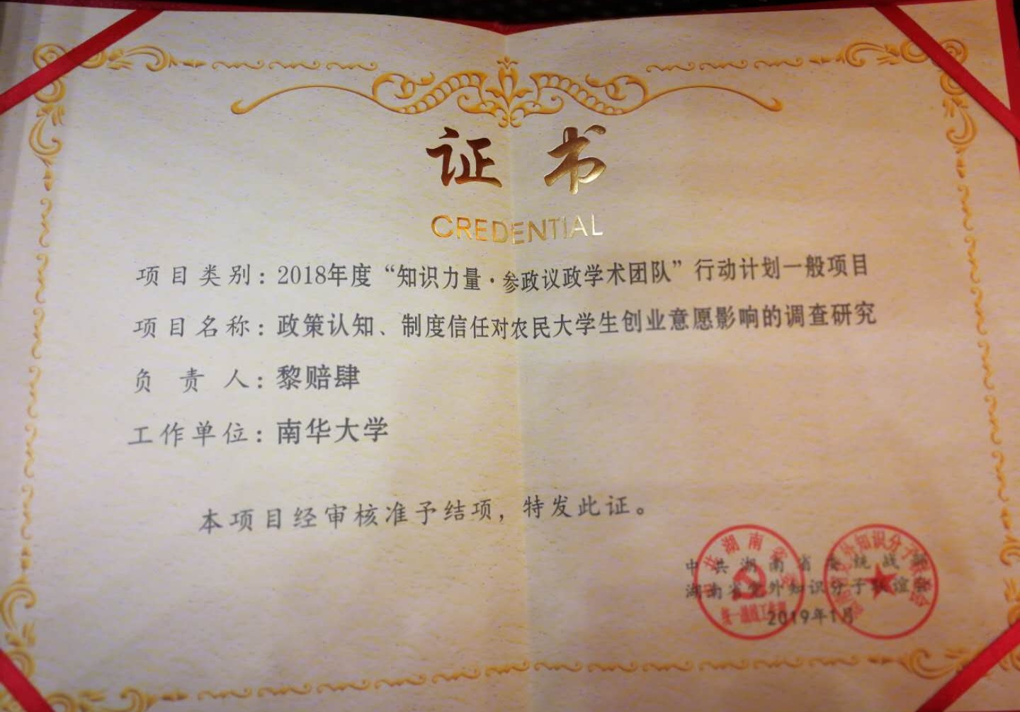 会上通报了“知识力量·参政议政学术团队行动计划”调研课题评审情况。2018年,全省无党派人士和广大党外知识分子充分发挥人才荟萃、智力密集的优势,紧紧围绕全省经济社会发展大局选题开展调研,共提交提交调研报告50余个,涉及乡村振兴、金融风险防控、环境治理、科技创新、产业发展等多个领域。其中我校黎赔肆教授的“政策认知、制度信任对农民大学生创业意愿影响的调查研究”和陈忠泽教授的“湖南省电子信息产业转型发展策略研究报告”获批为2018年度“知识力量·参政议政学术团队”行动计划一般项目并获资助。