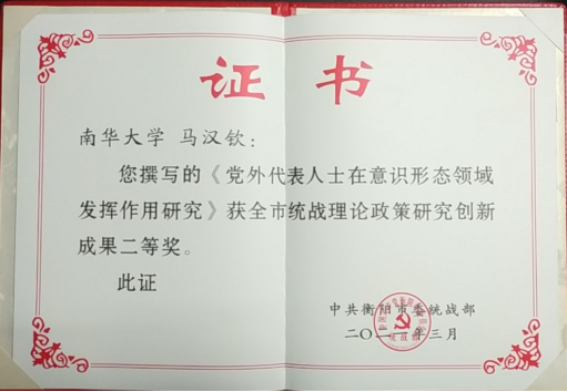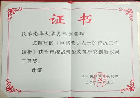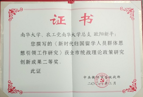 近期,衡阳市委统战部对2020年度全市统战理论政策研究创新成果进行通报,我校四篇理论文章获统战理论政策研究创新优秀成果篇目。四篇成果分别获得两项二等奖,两项三等奖。其中二等奖是由民盟盟员马汉钦撰写的《党外代表人士在意识形态领域发挥作用研究》和农工党员欧阳新平撰写的《新时代归国留学人员群体思想引领工作研究》,三等奖是由民革党员刘朝晖撰写的《网络意见人士的统战工作浅析》和马汉钦撰写的《公民网络参政背景下的民主党派参政能力提升研究》。